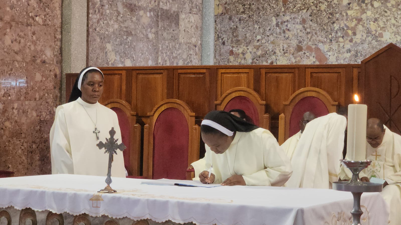 No dia 13 de janeiro de 2013, entrei na comunidade de Santa Catarina de Sena, no Golungo Alto, para iniciar o Aspirantado, um período de crescimento humano, espiritual e comunitário. Mais tarde, a 7 de janeiro de 2017, comecei o Postulantado na comunidade de São José, Km 9. Depois, fui chamada a continuar a caminhada no noviciado, etapa que marcou profundamente a minha vida, sobretudo no dia da tomada do hábito, momento que guardo com emoção e gratidão.