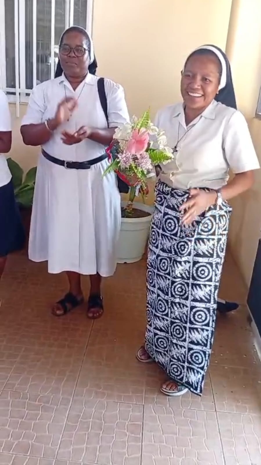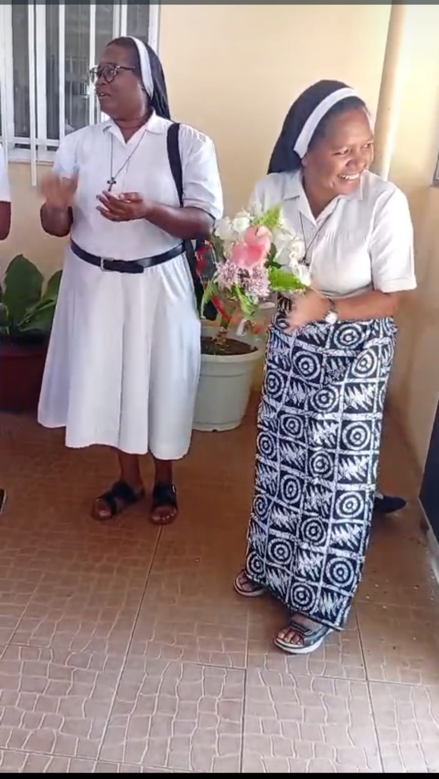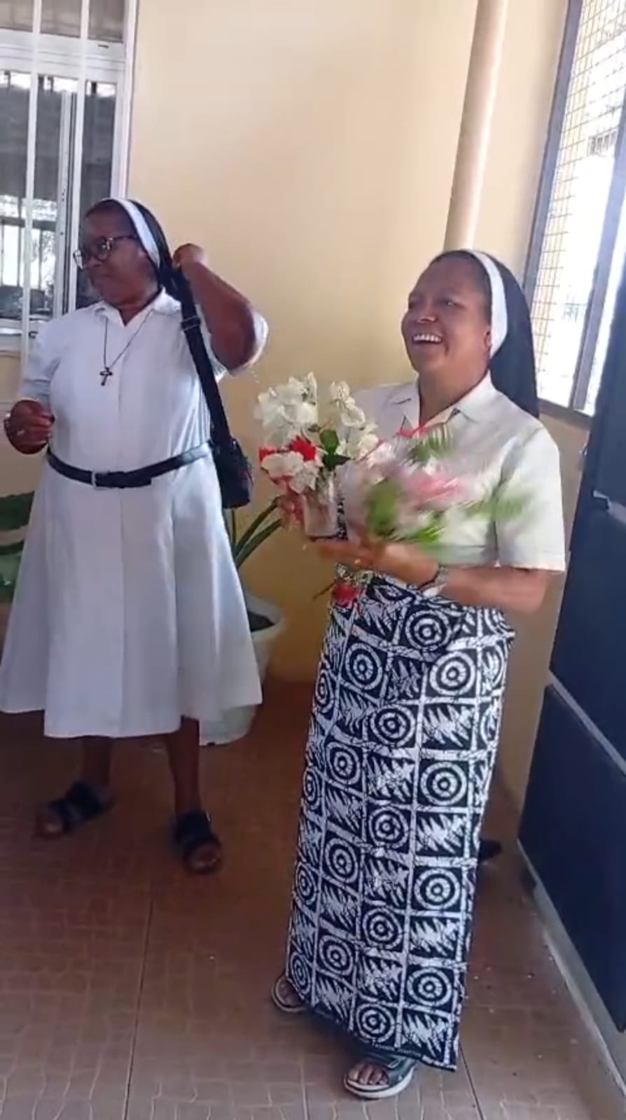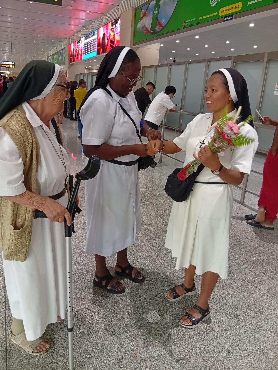 A chegada a Angola foi um momento de profunda emoção. No Aeroporto, aguardavam-na a Madre Provincial – Ir. Maria Manuela Nacandumbo, e cinco Irmãs – Ir. Antónia, Ir. Aurora, Ir. Margarida, Ir. Ana e Ir. Luana, numa receção calorosa que dissipou qualquer traço de cansaço. Ao chegar à comunidade Nossa Senhora da Paz, Km 9 – Viana, Casa de Formação, foi surpreendida por um acolhimento ainda mais tocante: as Noviças, Postulantes e a Irmã responsável entoaram um cântico de boas-vindas que, nas palavras da própria Irmã Ediana, “parecia o canto dos Anjos”.